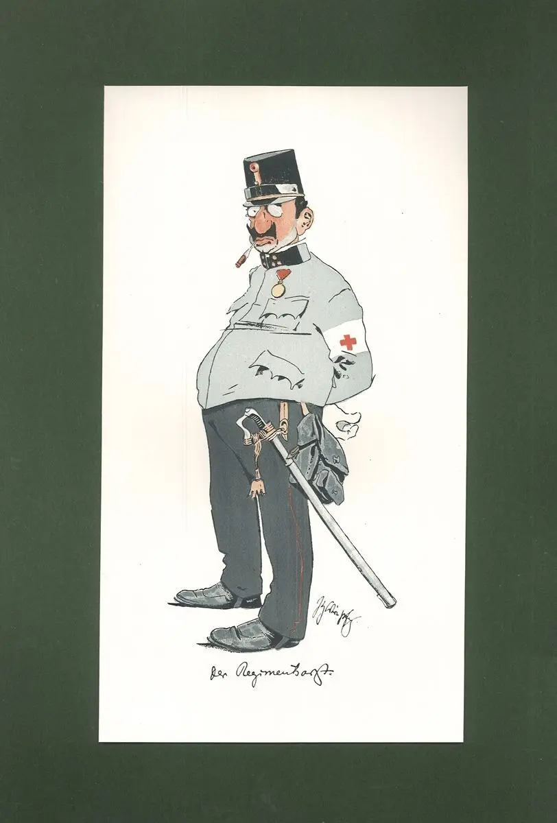 Bemerkungen: Humoristische Karikaturen versch Arzttypen: Frauenarzt, Chirurg, Hypnotiseur, Regimentsarzt, Landarzt, Kinderazt u. a.