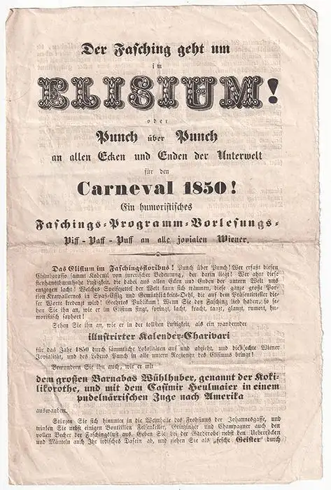 Bemerkungen: Das Blattt bietet einen Rundgang durch das Etablissement und das Programm, das zahlreiche Sensationen und dazu noch Modernität bietet. Einer von vielen Zwischentiteln lautet: `Eldorado!!! - maurischer Prachtpalast. In diesem Eldorado geht selbst den Paperln ein Licht auf, und dazu noch ein Gaslicht!` Am 1. März 1840 eröffnete das Neue Elysium, eine biedermeierliche Erlebniswelt in den Kellerräumen des Klosters St. Anna, unterhalb des St. Annahof in der Johannesgasse 4, (Wien, Innere Stadt). Das Lokal, programmatisch als `unterirdische Wanderung durch die Welt` benannt, wurde zu einer der Hauptattraktionen des vormärzlichen Wien. Hier wurden grottenbahnartig die großen Kontinente präsentiert, für den Transport sorgte eine unterirdische Pferdeeisenbahn. Musik, Tanz, akrobatische Darstellungen und kulinarische Genüsse wurden geboten, es gab auch Projektionsvorstellungen (Nebelbilder) nach Art der Laterna magica. Im Dezember 1840 bereicherte Daum sein Etablissement um den zunächst fehlenden Kontinent `Australien`. 1854 starb Josef Daum an der Cholera, sein Sohn führte das Etablissement zunächst fort, musste es aber nach stark rückläufigem Erfolg 1864 (nach anderer Darstellung 1857) schließen.