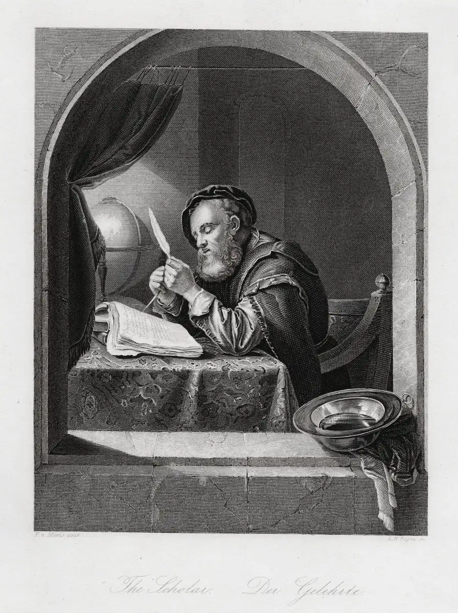 Der Gelehrte: Porträt. Originaler Stahlstich n. Mieris um 1850