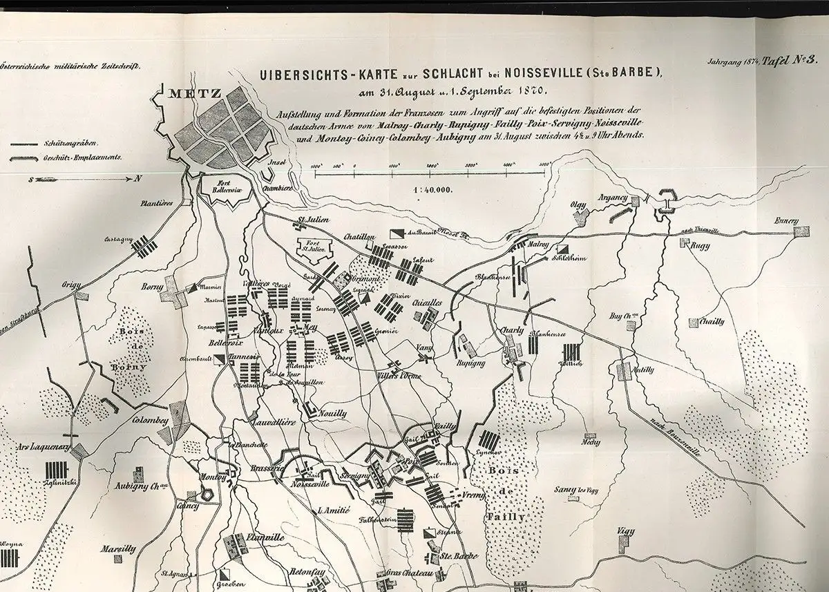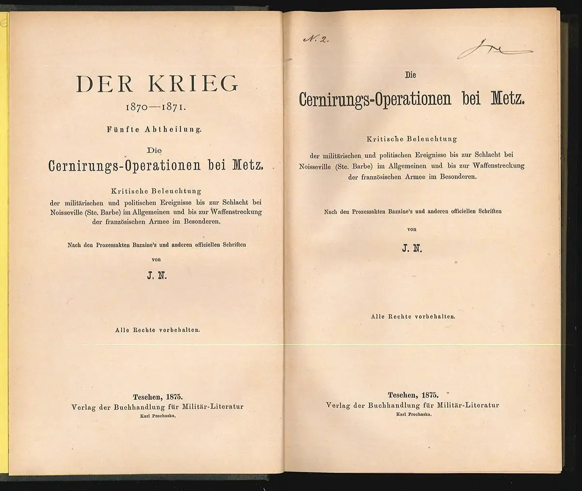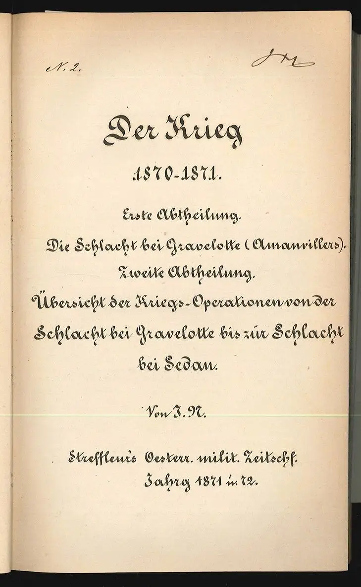Bemerkungen: 1. Abtheilung: Die Schlacht bei Gravelotte (Amanvillers). 2. Abtheilung: Übersicht der Kriegs-Operationen der Schlacht bei Gravelotte bis zur Schlacht von Sedan. 3. u. 4. Abtheilung: Die Cernirungs Operationen bei Strassburg und Metz. Durchbruchversuch der Franzosen aus Metz. 5. Abtheilung: Die Cernirungs-Operationen bei Metz. Kritische Beleuchtung der militärischen und politischen Ereignisse ... bis zur Waffenstreckung der französischen Armee. Band 1 u. 2 mit handschriftlichen Titel und wurden in Wien in Streffeurs Oesterr. milit. Zeitschrift herausgegeben.