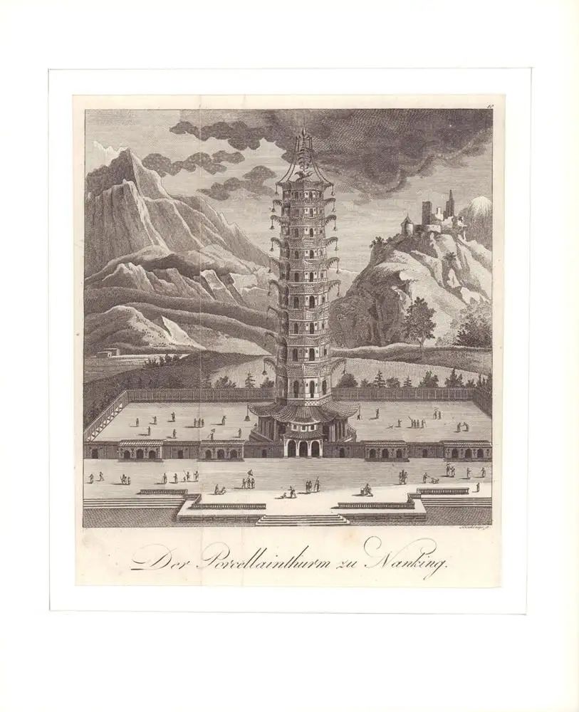 Porzellanturm: ein Anfang des 15. Jahrhunderts in Nanking in China erbauter 80 m hoher, aus neun Stockwerken bestehender u. mit dicken Porzellan-Platten bekleideter Turm, welcher während der Revolution der Taiping (1852-64) zerstört wurde. - Carl Robert Schindelmayer (1769-1839), österreichischer Kupferstecher. - Leicht stock- u. fingerfleckig, Blattränder gebräunt, mit Bugfalte; sonst gut