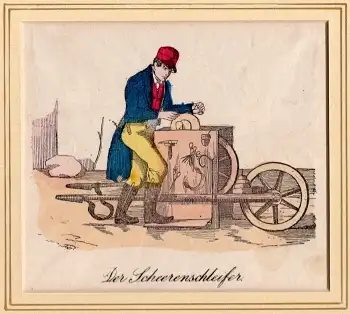 Der Scherenschleifer original Holzschnitt Altkoloriert um 1820