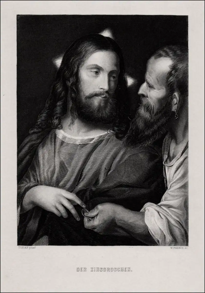 Der Zinsgroschen. Originaler Stahlstich nach Tizian um 1850