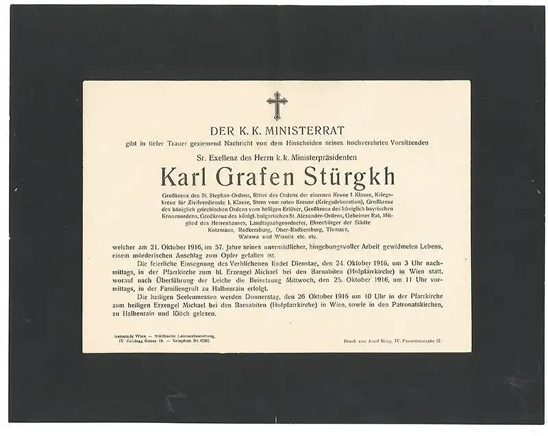 Bemerkungen: Czeike V, 392 - Traueranzeige für Karl Graf Stürgkh (1895-1916), der am 21. Oktober 1916 von Friedrich Adler (1879-1960), Sohn von Victor Adler, im Wiener Restaurant "Meissl & Schadn" erschossen worden war. Stürgkh hatte nach Kriegsausbruch 1914 den Reichsrat vertagen lassen und sich gegen eine neuerliche Einberufung gewehrt.