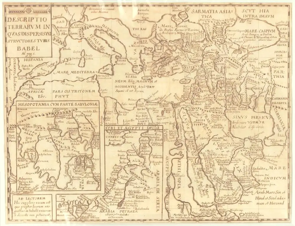 Kupferstichkarte mit zwei Nebenkarten, zeigt die Verteilung der Nachkommen Noahs nach dem gescheiterten Turmbau zu Babel: von Sarmatien bis zum Kaspischen Meer bis zum nordwestlichen Zipfel des Indischen Ozeans bis zur Höhe der Insula Dioscoridis (Sokotra, Jemen). Die Nebenkarten zeigen 1. Mesopotamien mit einem Teil Babylons und 2. Teile Syriens und Ägyptens. - Mit Bugfalte u. winzigen Löchlein in der unteren Mitte, schwach gebräunt