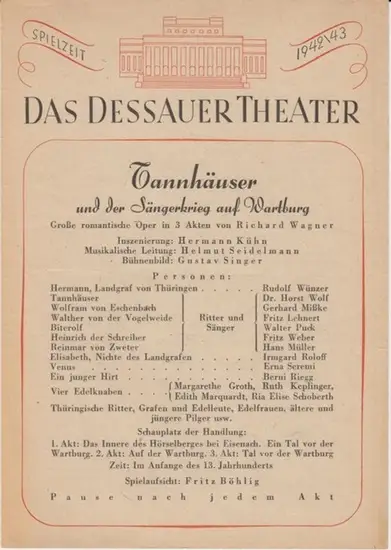 Titel: Dessauer Theater. Programmzettel zu : Tannhäuser und der Sängerkrieg auf Wartburg ( Richard Wagner ). - Spielzeit 1942 / 1943. - Inszenierung: Hermann Kühn. - Bühnenbild : Gustav Singer. - Spielaufsicht: Fritz Böhlig. - Darsteller: Rudolf Wünzer, Horst Wolf, Gerhard Mißke, Fritz Lehnert, Irmgard Roloff u. a. - Mit ausführlicher Inhaltsangabe.