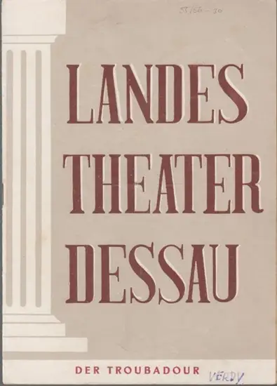 Dessau. - Landestheater. - Anhaltisches Theater. - Intendant: Willy Bodenstein. - Red.: Erhard Schmidt. - Giuseppe Verdi: Landestheater Dessau. Heft 30 der Spielzeit 1955 / 1956. - Mit Besetzungsliste zu: Der Troubadour ( Verdi ). - Inszenierung: Willy Bo