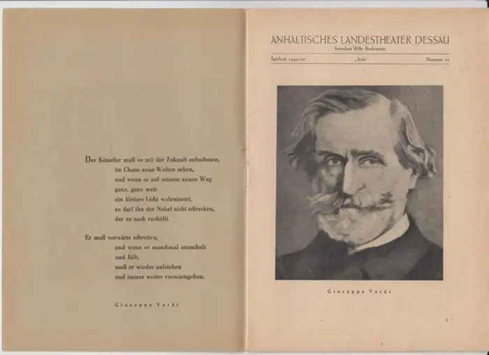 Titel: Anhaltisches Landestheater Dessau. Heft 20 der Spielzeit 1949 / 1950. - Mit Besetzungsliste zu: Aida ( Oper von Antonio Ghislanzoni, Musik: Giuseppe Verdi ). - Inszenierung: Willy Bodenstein. - Bühnenbild und Kostüme: Manfred Schröter. - Darsteller: Hans Müller, Magdalena Güntzel, Elvira Overbeck, Werner Grafe, Kurt Böttger, Toni Weiler, Kurt Reinhardt und Erna Bellmann. - Weiter Inhalt u. a. : Zum Stück / Einfachheit oder Originalität ? ( Aus ' Verdi ' , Roman von Franz Werfel ) / Aus Verdis Leben