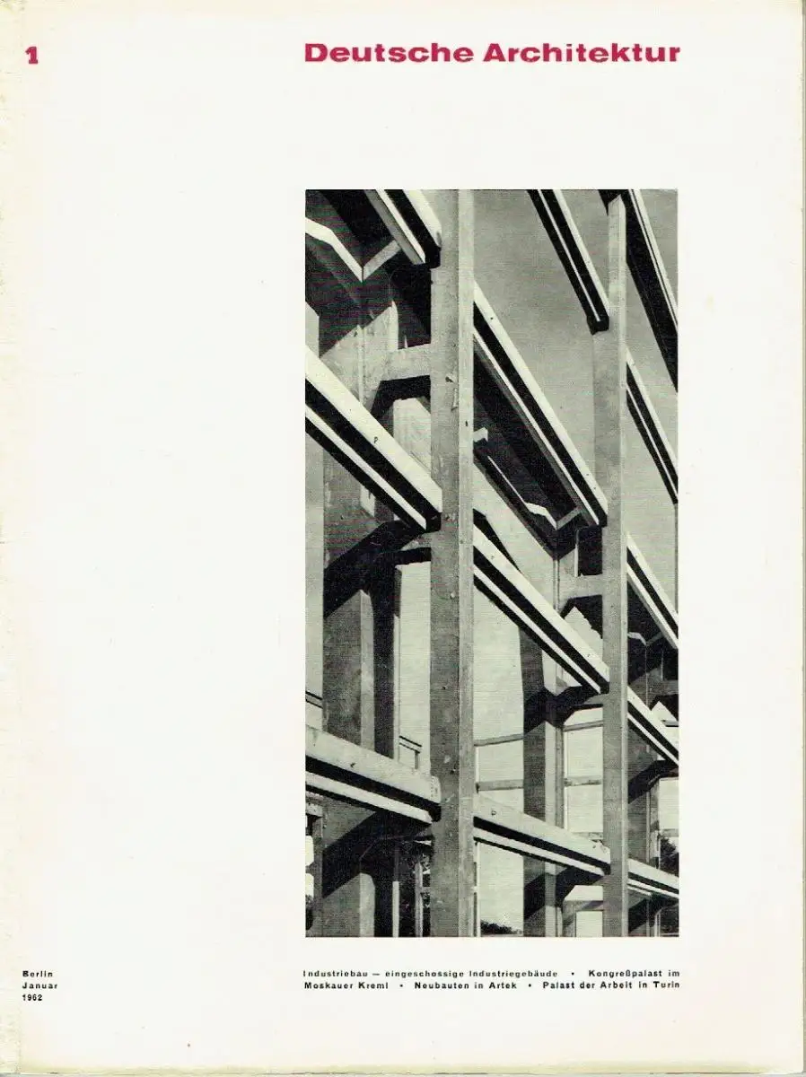 sehr guter Zustand, geringe Gebrauchs- und Alterungsspuren: Rücken unten ca. 4 cm aufgerissen - kleine Blessuren - Rückseite unten mit kleinem Eselsohr, alle Artikel ohne Angabe der (Länge) sind 1-3 Seiten lang - Das XXVIII. Plenum der Deutschen Bauakademie - Zum 10. Jahrestag der Deutschen Bauakademie - Grußadresse des ZK der SED - Begrüßungsansprache von Paul Verner (5 Seiten) - Die Herausgeber an die Leser - Eine Zeitschrift, wie wir sie brauchen - Industriebau — eingeschossige Industriegebäude - Industrialisierung und Architektur im Industriebau (4 Seiten) - Die Aufgaben und Maßnahmen zur schnellen Industrialisierung des Industriebaus - Zur Entwicklung eingeschossiger Industriegebäude aus getypten Mehrzwecksegmenten (10 Seiten) - Die Praxis fordert das Baukastensystem - Der Architekt und seine Verantwortung - Voraussetzungen der architektonischen Gestaltung im Industriebau - Modellprojektierung im Industriebau - Komplexe Industriegebietsplanung - Zur Planung des neuen Industriegebietes Meißen-Zaschendorf - Das Industriegebiet Meißen-Zaschendorf - Architekturdiskussion konkret - Technologe und Architekt - Der neue Kongreßpalast im Moskauer Kreml - Einzelheiten zum Kongreßpalast (4 Seiten) - Neubauten in Artek (4 Seiten) - Ein neuer Bau von Nervi in Turin (4 Seiten) - Umschau - Informationen, kartoniert, ca. 23 x 31, 64 Seiten mit zahlreichen Bildern