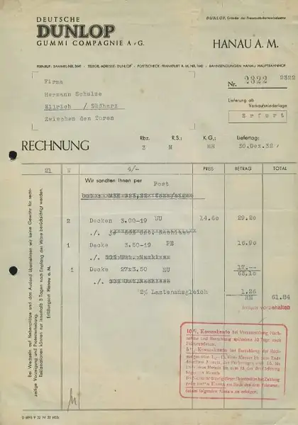 Deutsche Dunlop Gummi Companie, Hanau Rechnung 1932/33