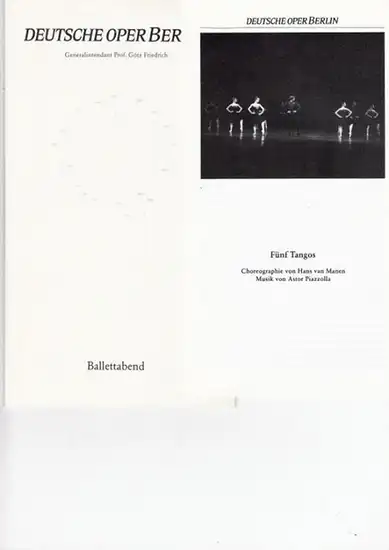 Titel: Ballettabend. Generalintendant Friedrich, Götz. - 5 Programme. Choreographie Manen, Hans van / Bejart, Maurice. - 1. Fünf Tangos. 2. Adagio Hammerklavier. 3. Daphnis und Chloe. 4. Bolero Ravel. 5. Sinfonie für einen einsamen Menschen. - Musik : Piazzolla, Astor / Beethoven u. a