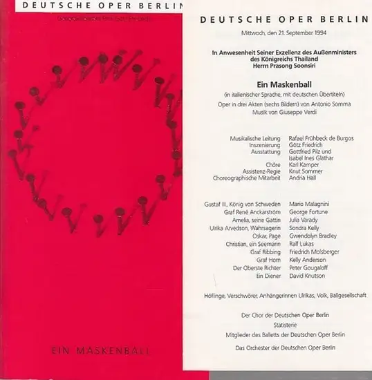 Deutsche Oper Berlin. Generalintendant Prof. Götz Friedrich. Musik Giuseppe Verdi / Antonio Somma: Ein Maskenball. Spielzeit 1993 / 1994. Inszenierung Götz Friedrich. Ausstattung Gottfried Pilz / Isabel Ines Glathar. Musikikalische Leitung Rafael Frühb