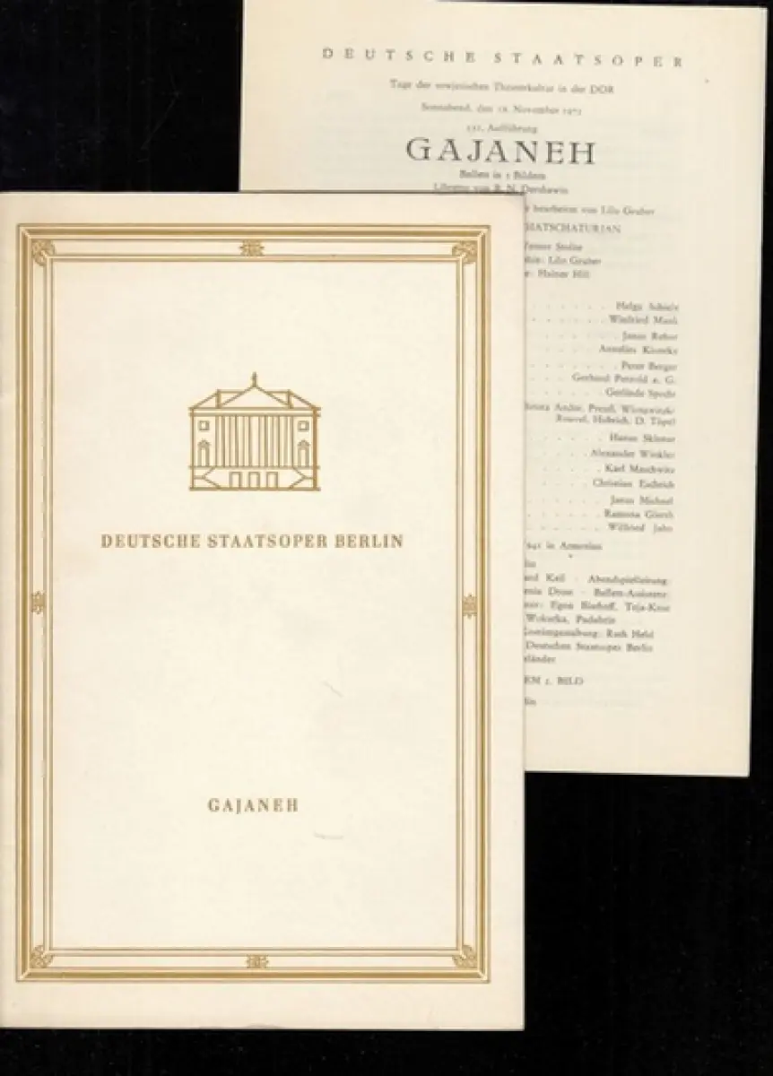 Titel: Programmheft zu: Gajaneh. Ballett in 5 Bildern. 18. November 1972, im Rahmen der Tage der sowjetischen Theaterkultur in der DDR. Musikalische Leitung: Werner Stolze. - Inszenierung und Choreographie: Lilo Gruber. - Bühnenbilder und Kostüme: Hainer Hill. - Mitwirkende: Helga Schiele, Winfried Mank, Janus Rehor, Annelies Kiontke, Hanus Sklenar u. a.