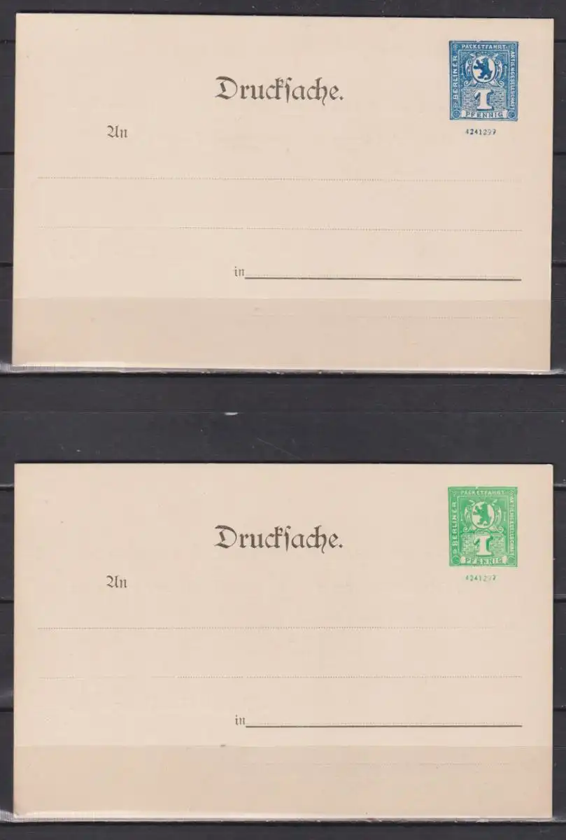 Dt.Reich Privatpost-Ganzsachen Berliner Packetfahrt Wert-o 1 Pf. grün und 1Pf. blau, rs Zudruck "Berliner Philatelisten-Club