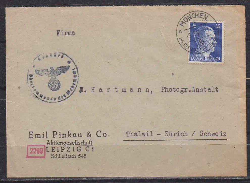 Dt.Reich Auslandsbrief München 9.11.42 in die Schweiz mit OKW-Zensur d der Zensurstelle München , Banderole + Prüf-o