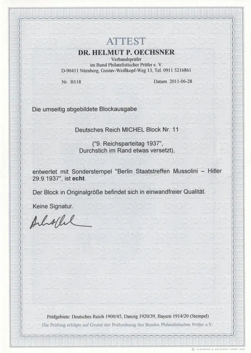 Deutsches Reich: Block 11 gestempelt: Durchstich versetzt mit BPP Attest