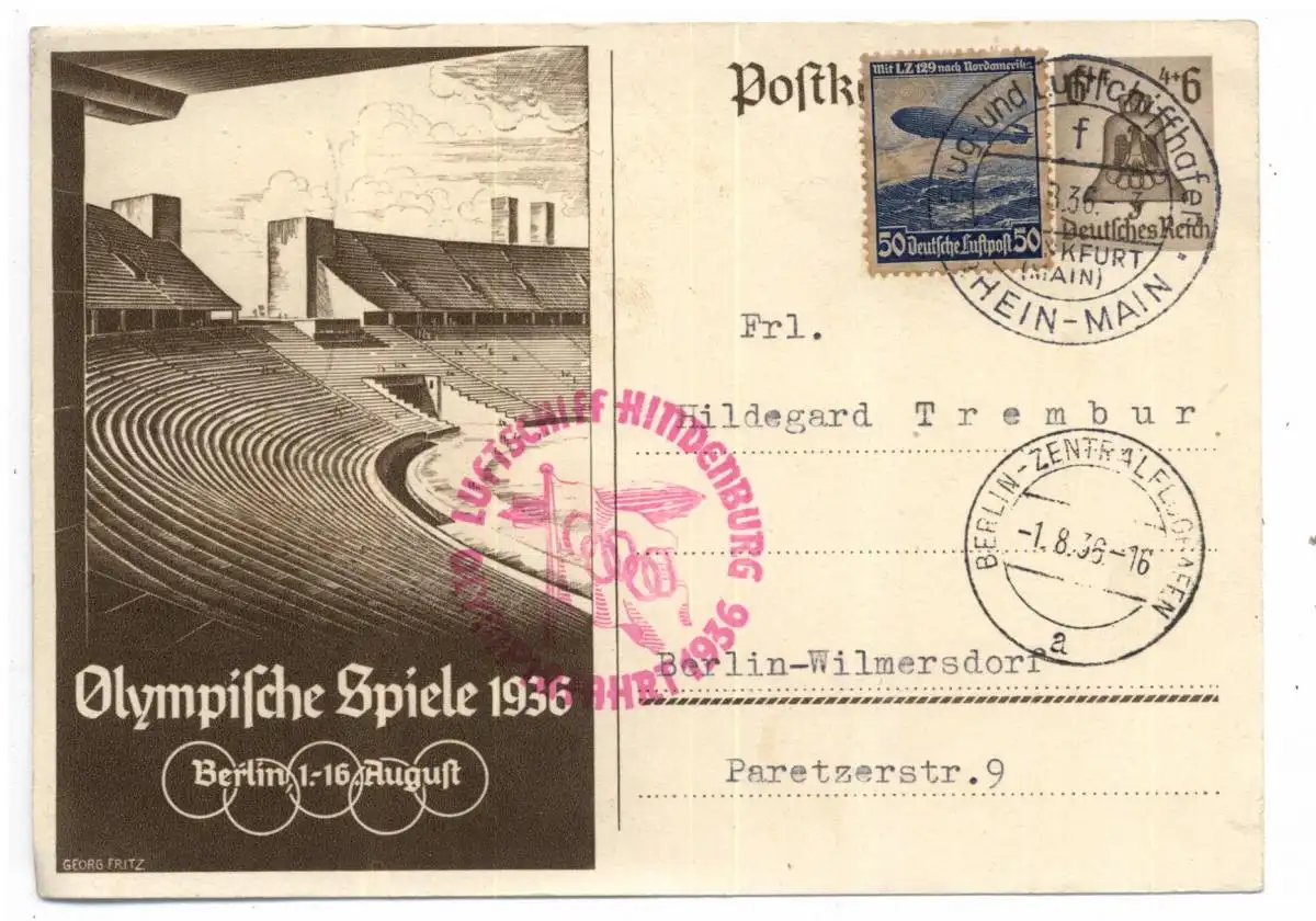 OLYMPIA 1936 BERLIN - ZEPPELIN OLYMPIAFAHRT, 01.08.36 Frankfurt - BERLIN auf Olympia Ganzsache, Ersttag der Spiele