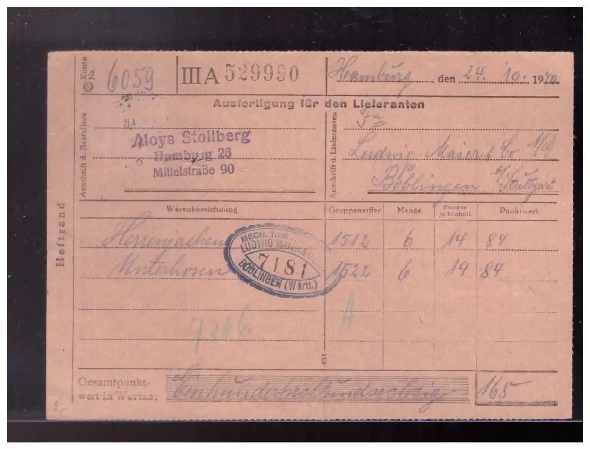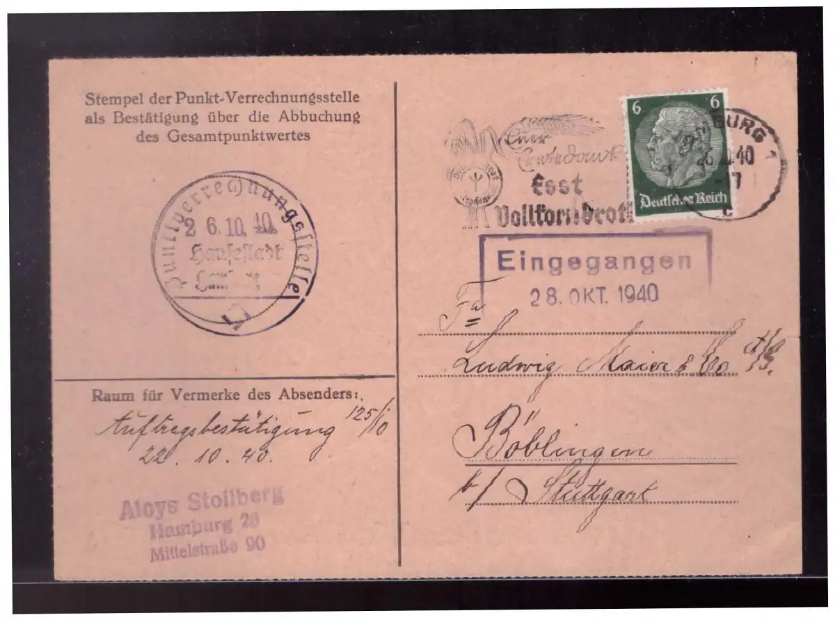Dt- Reich (023567) Postkarte Punkteverrechnungstelle Hansestadt Hamburg , gelaufen Hamburg 26.10.1940