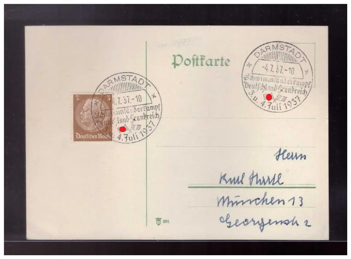 DT- Reich (023849) Postkarte mit Sonderstempel Darmstadt, Schwimmländerkampf Deutschland- Frankreich, gest. am 4.7.1937