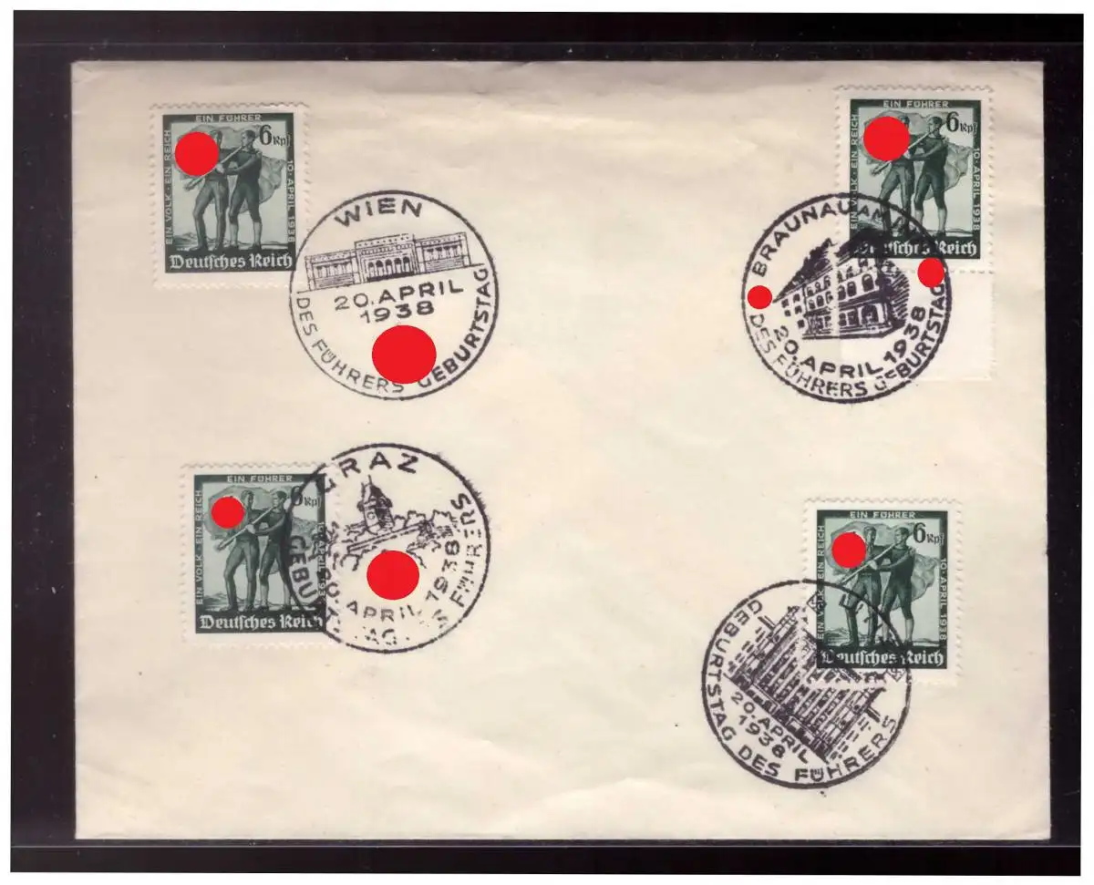Dt- Reich (023938) Umschlag mit 4 verschiedenen SST des Führers Geburtstag, Wien, Graz, Braunau, Linz alle vom 20.4.1938