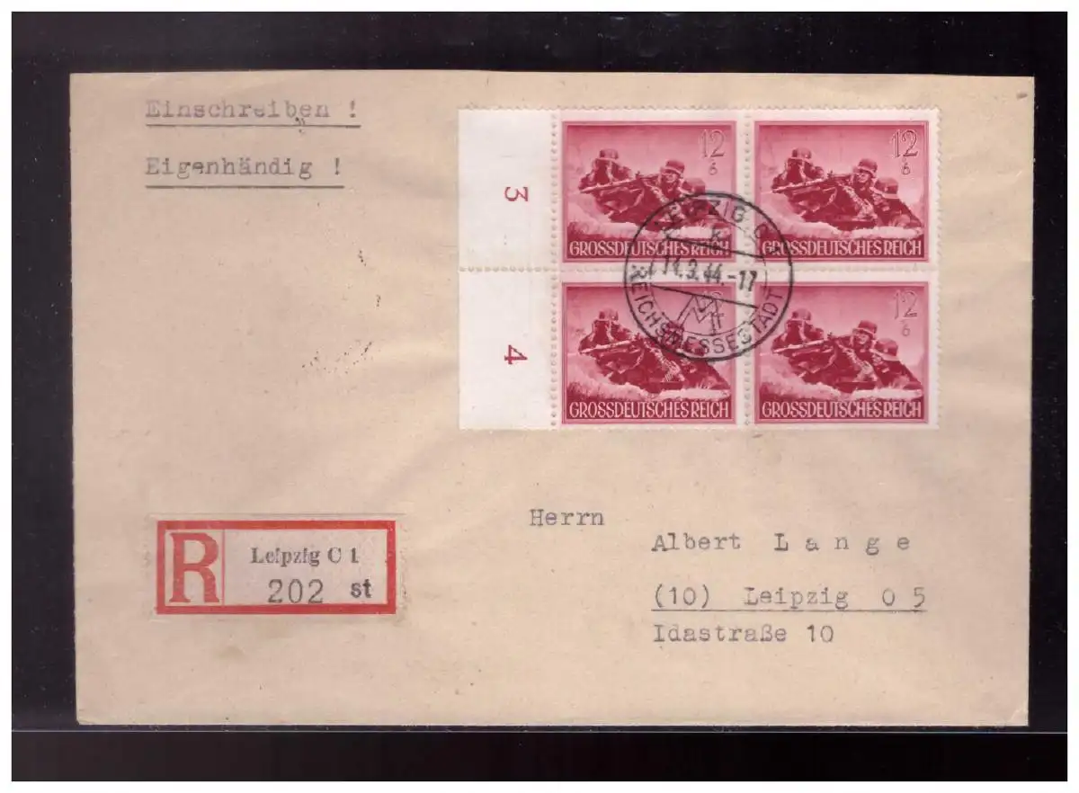 Dt- Reich (023952) Einschreiben, Eigenhändig Wehrmacht II Viererblock mit Rand MNR 879 mit SST Leipzig am 14.8.1944