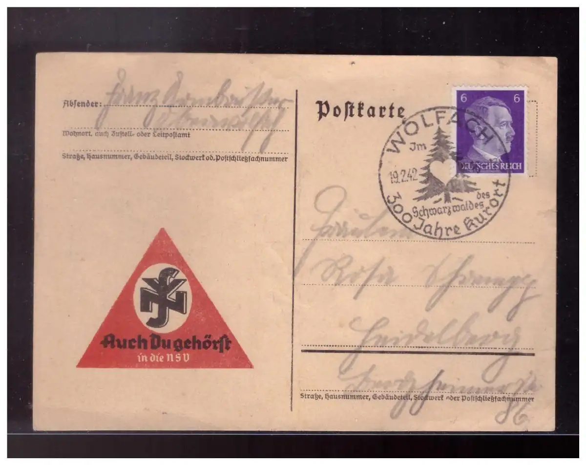 Dt- Reich (024055) Vorgedruckte Propagandavignette auf Postkarte Auch Du gehörst in die NSV, gelaufen mit SST Wolfach 42
