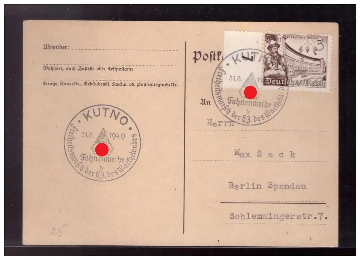 Dt- Reich (024078) Postkarte mit Propagandastempel HJ,Freiheitsmarsch der HJ des Warthelandes, fahnenweihe Kutno 31.8.40