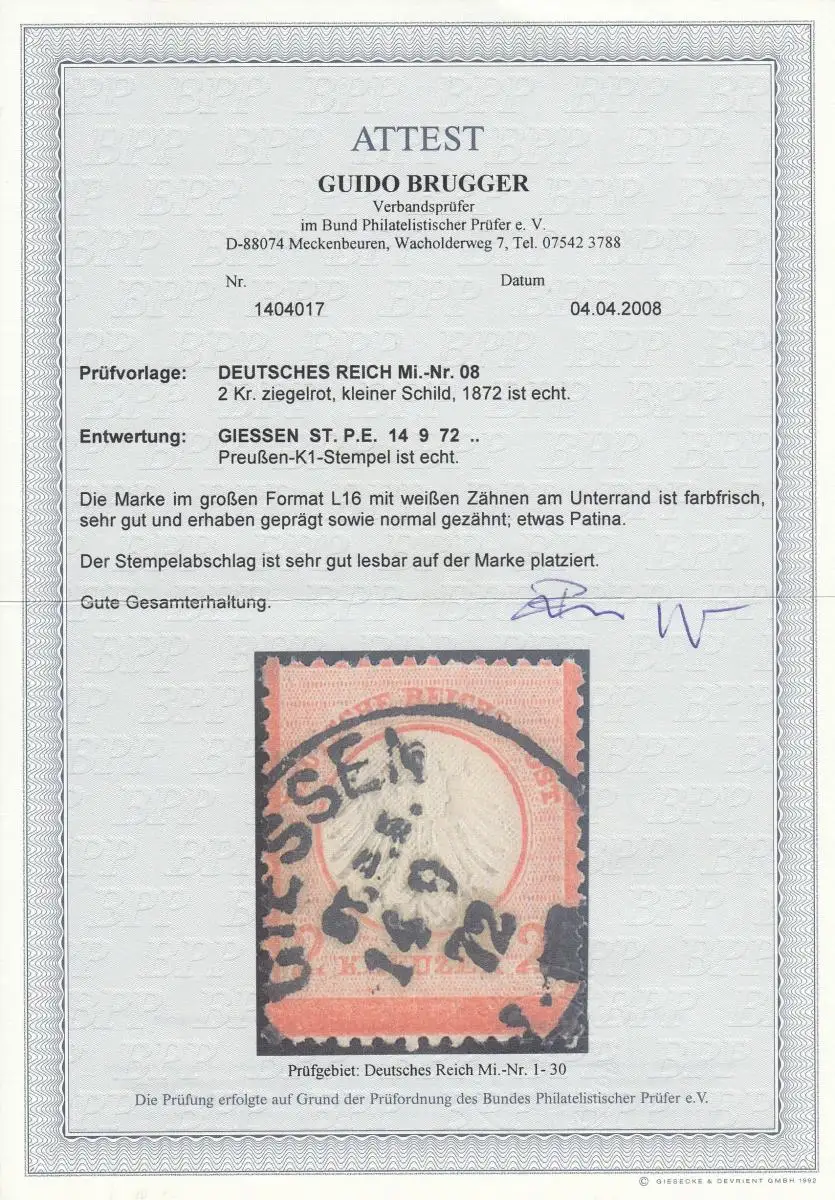Deutsches Reich: MiNr. 08, großes Format L16, Stempel Giessen, BPP Attest