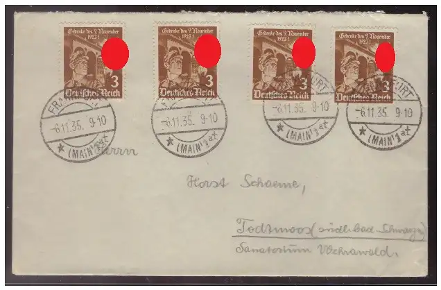 Dt- Reich (008412) Brief Mef 4 x Feldherrenhalle MNR 598, gelaufen Frankfurt am 6.11.1935
