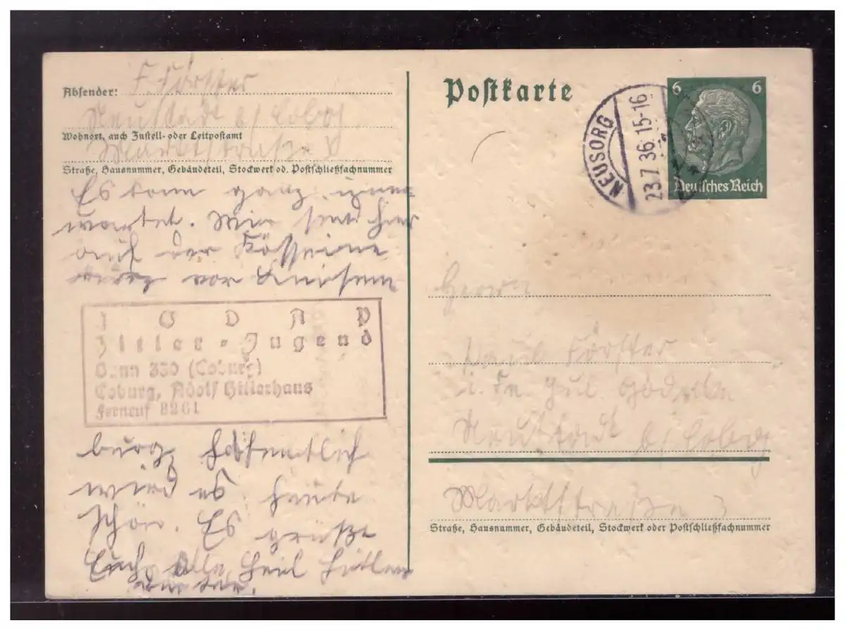 Dt- Reich (008525) Propaganda Ganzsache mit HJ Stempel Bann 330, Coburg, gelaufen Neusorg am 23.7.1936