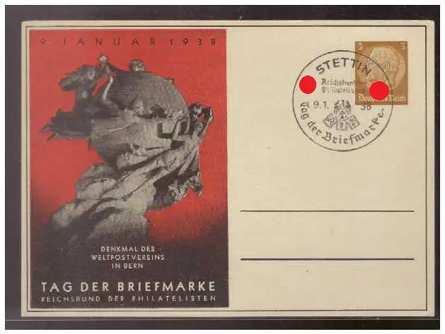 Dt- Reich (009286) Privatganzsache zum Tag der Briefmarke Fech C75/ 02, blanco mit Sonderstempel Stettin vom 9.1.1938