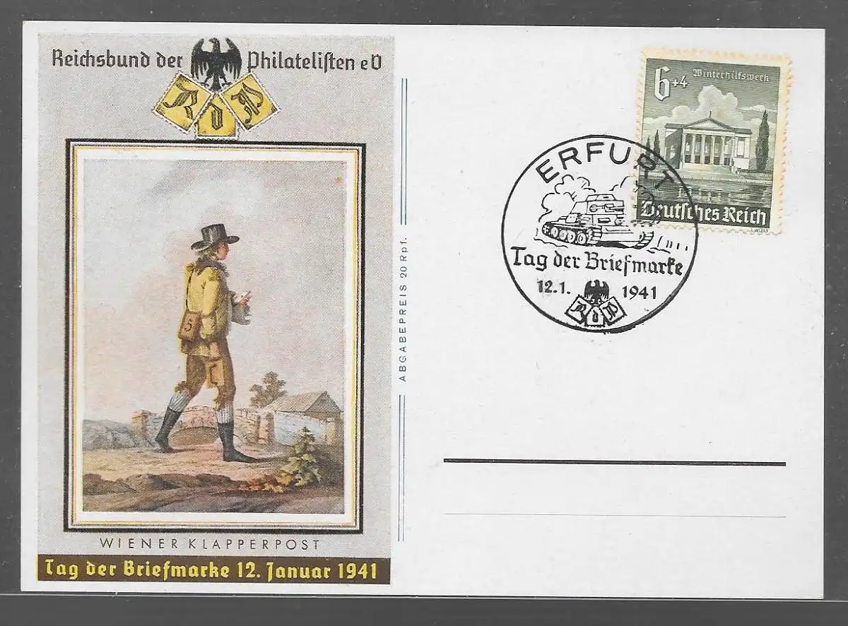 DT- Reich (009481) Postkarte zum Tag der Briefmarke Motiv Panzer blanco gestempelt Erfurt 12.1.1941