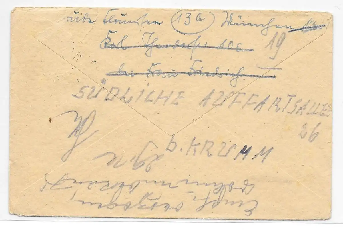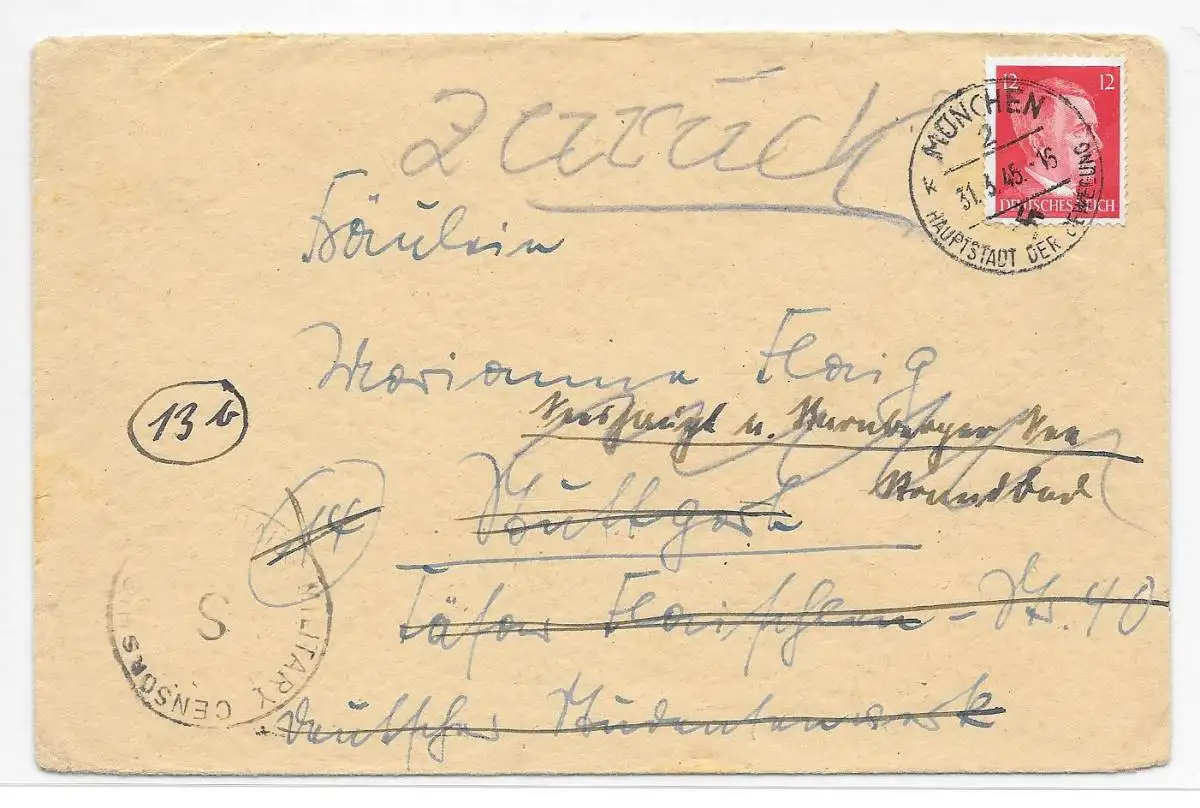 DT- Reich (009495) Überroller Fernbrief München vom 31.3.1945 mit Zurück Vermerk und US- Zensurstempel von Stuttgart