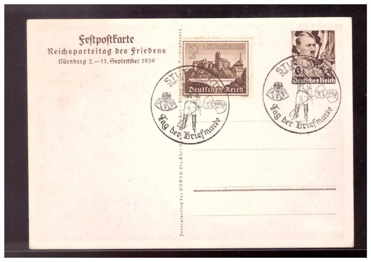 Dt.- Reich (020182) Propaganda Ganzsache P282, Reichsparteitag 1939, Festpostkarte, blanco gestempelt mit SST Stuttgart