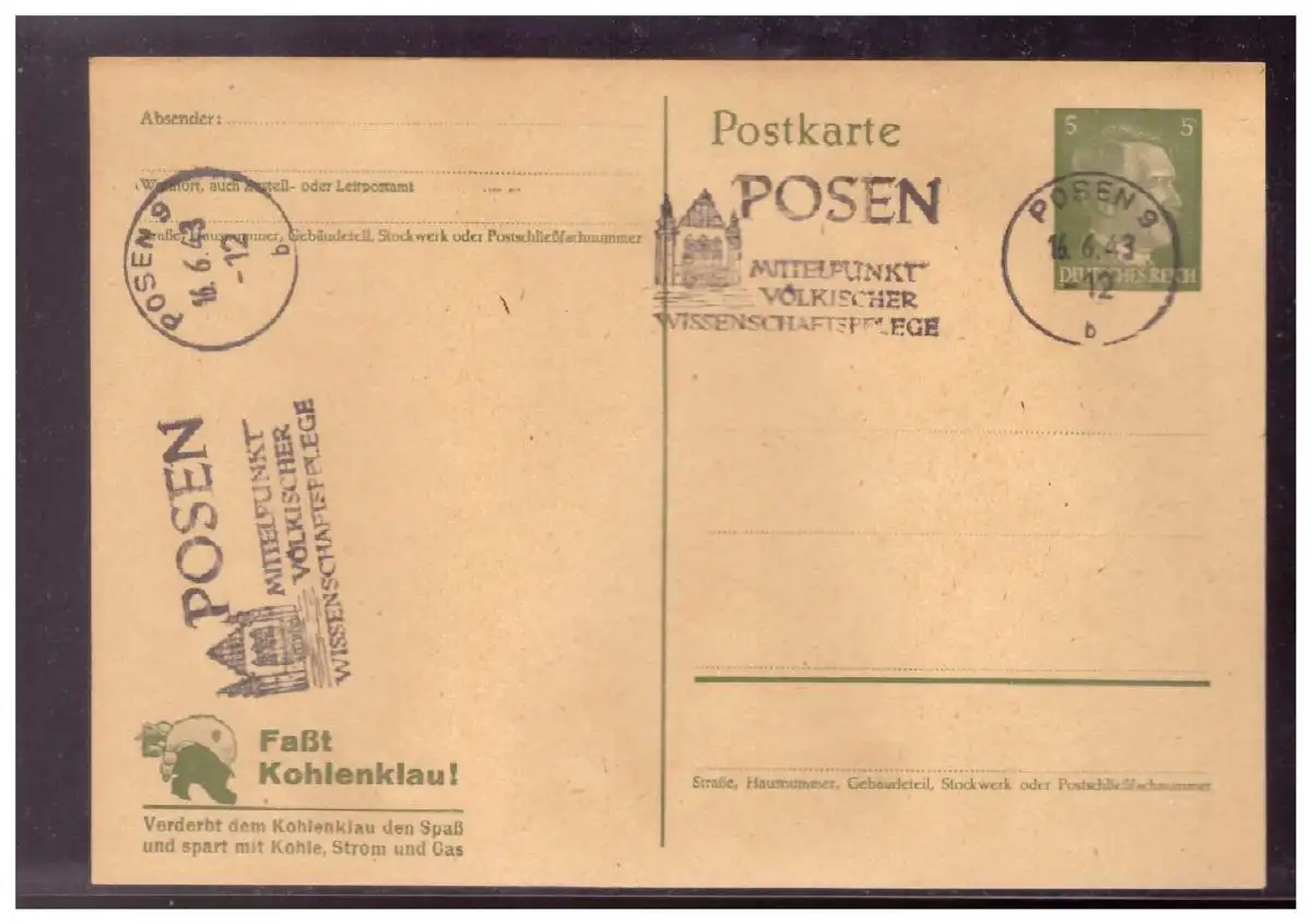 Dt.- Reich (020195) Propaganda Ganzsache P311/ 01 Faßt Kohlenklau ...., blanco gestempelt Posen 16.6.1943