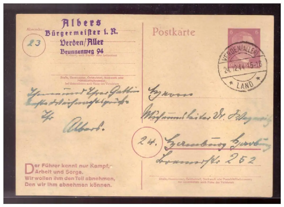 Dt.- Reich (020196) Propaganda Ganzsache P312/ 09 Der Führer kennt....., gel. mit Bürgermeisterstempel/ Verden und Orgin