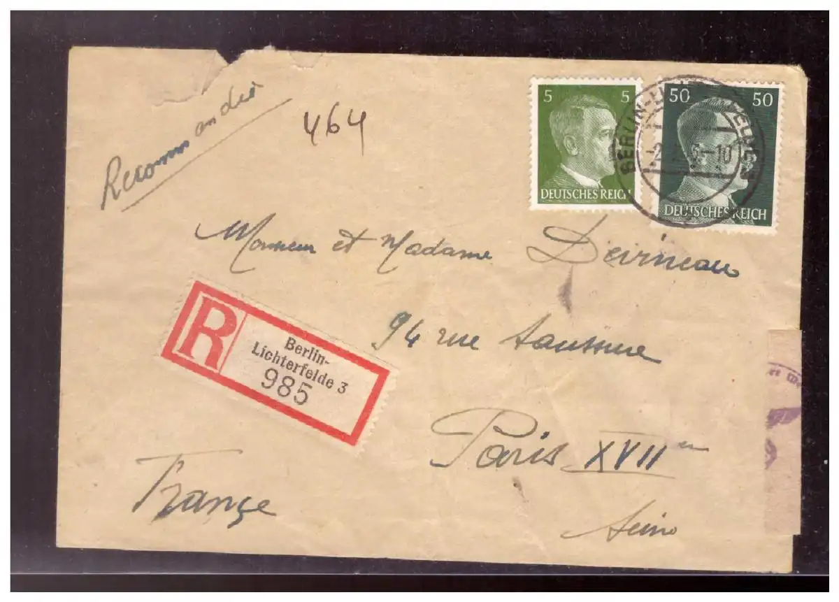 Dt- Reich (020242) Einschreiben- Ausland Berlin- Frankreich/ Paris am 2.9.1943 mit OKW Zensur