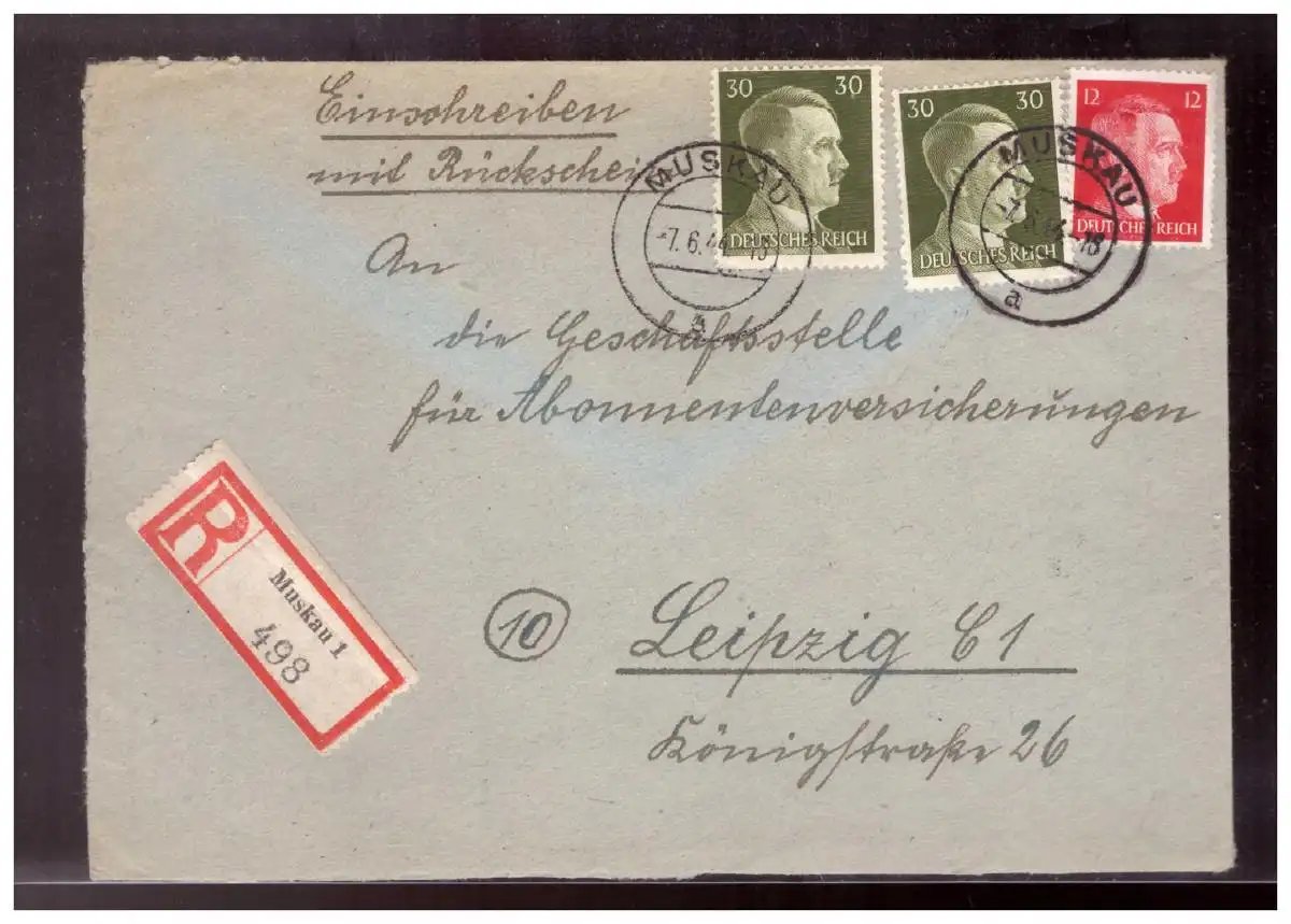 Dt- Reich (020252) Einschreiben- Rückschein 72 rpf gelaufen von Muskau nach Leipzig am 7.6.1944