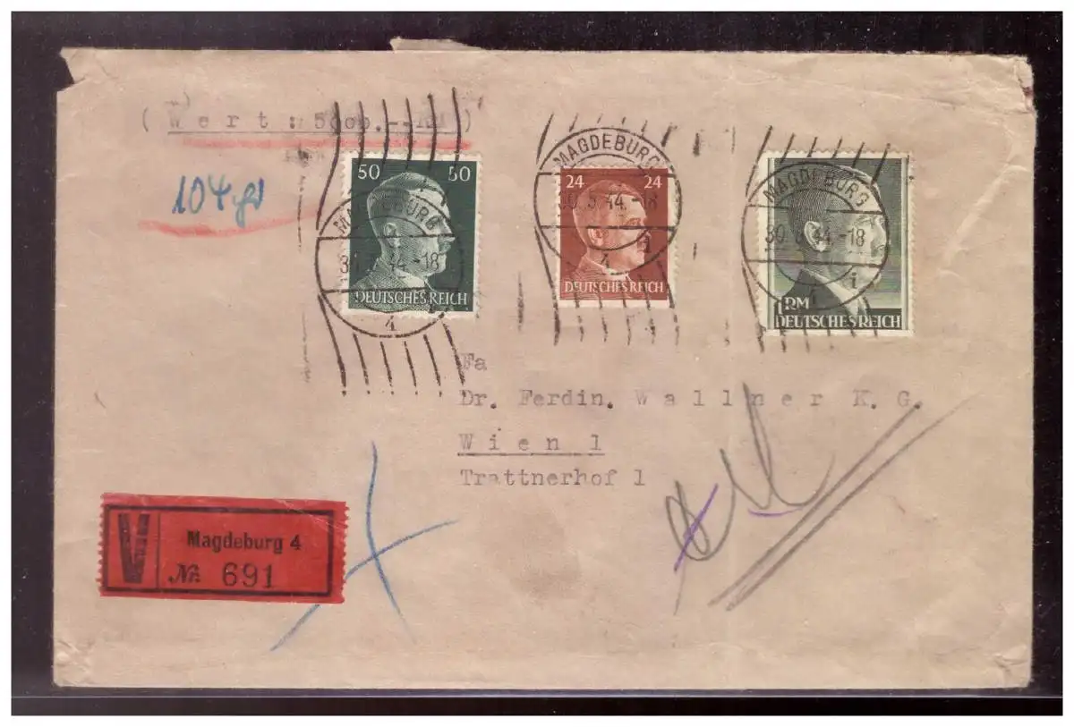 Dt- Reich (020264) Wertbrief gesiegelt über 5000,- RM gelaufen Magdeburg 30.5.44 mit MNR 799B mit Zusatzfrankatur