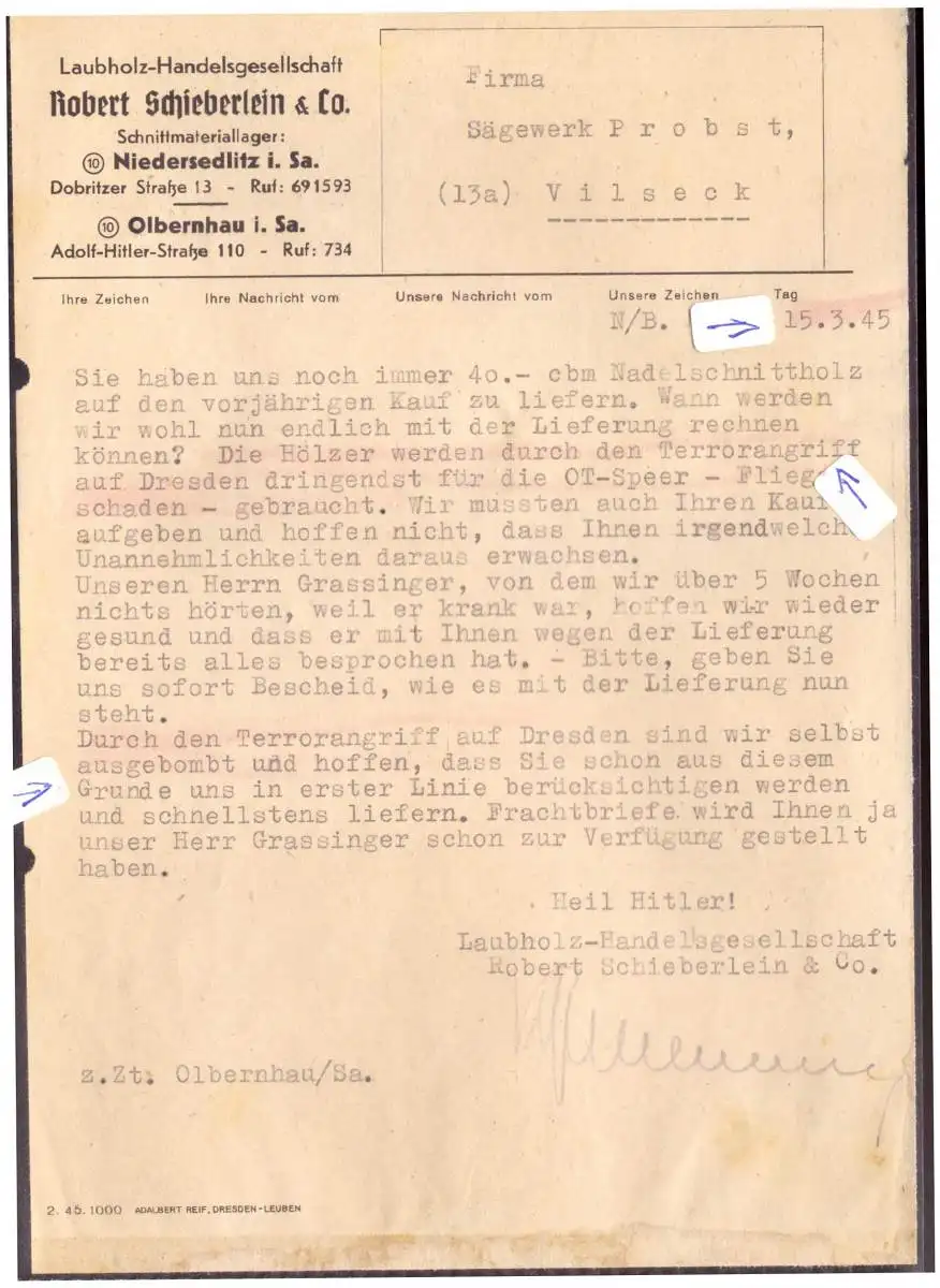 Dt- Reich (020345) Firmenbrief vorgedruckt späte Post vom 15.3.1945 Laubholz- Handelsgesellschaft Niedersedlitz
