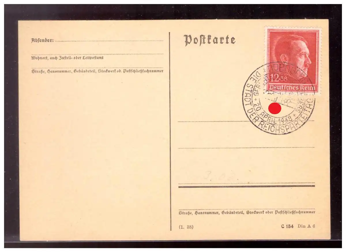 Dt- Reich (020806) Postkarte mit MNR 664 SST Nürnberg Stadt der Reichsparteitage, Geburtstag des Führers,am 20.4.1938