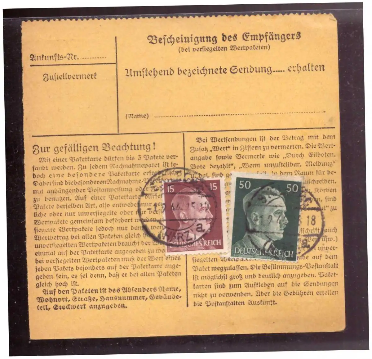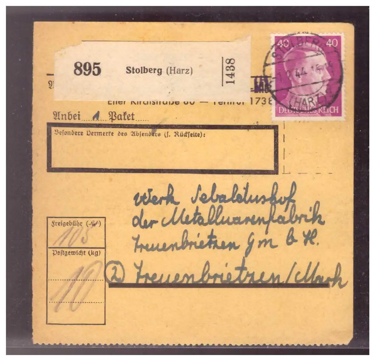 Dt- Reich (020969) Paketkarte Stolberg/ Harz von 1944