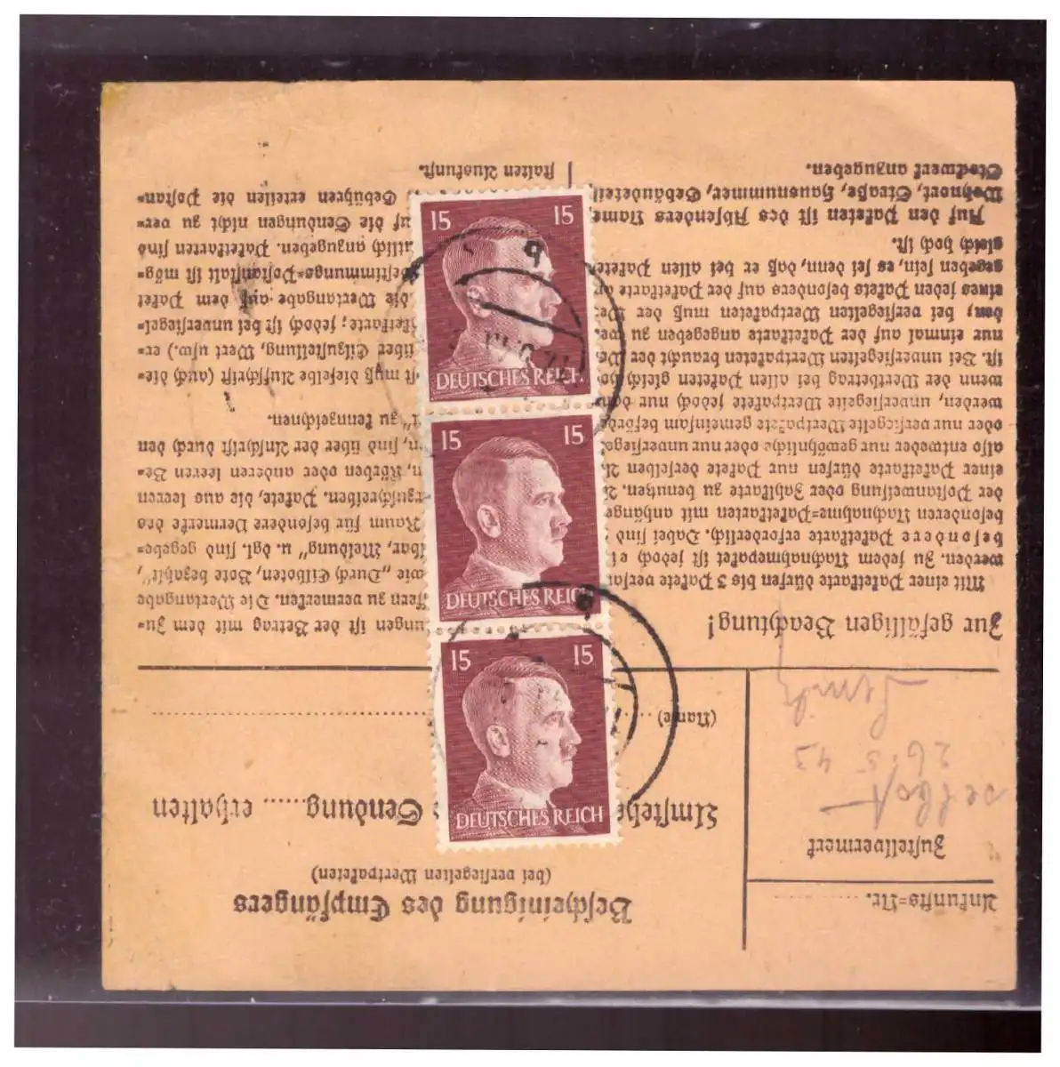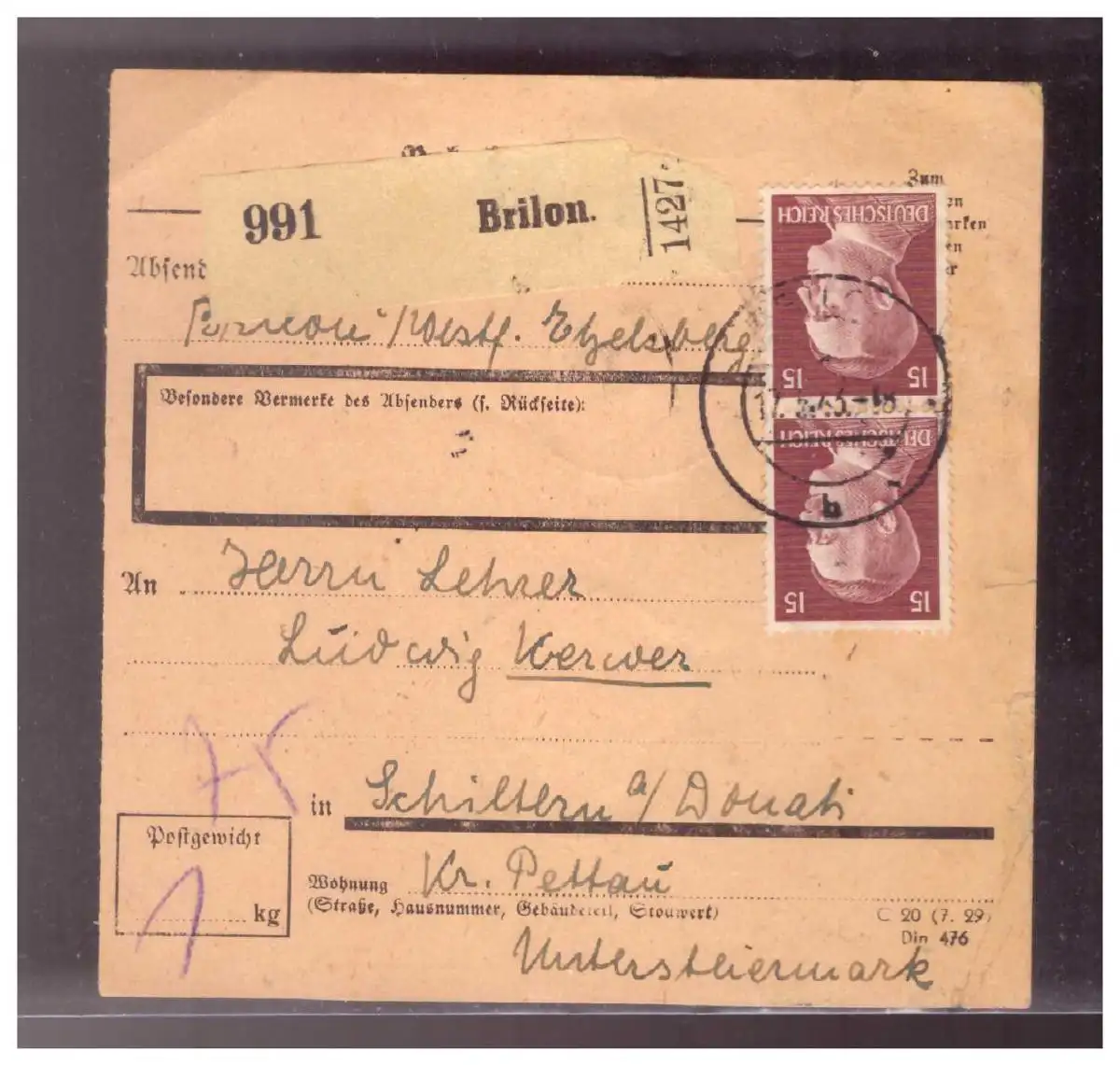 Dt- Reich (020974) Paketkarte Hitlerfrankatur Brilon vom 17.5.1943