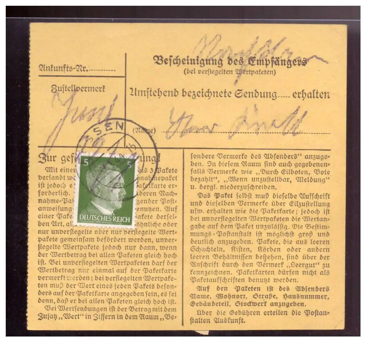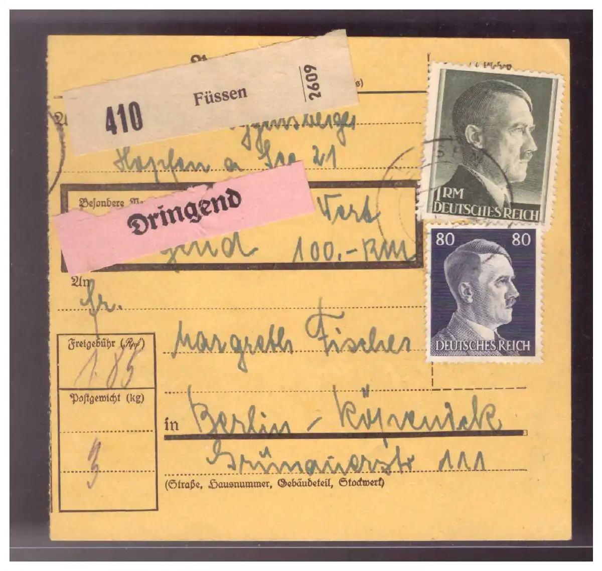 Dt- Reich (020982) Paketkarte Hitlerfrankatur Füssen vom 1944