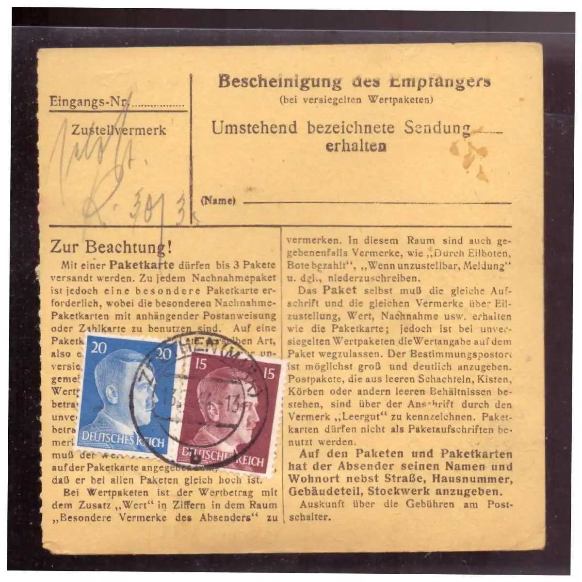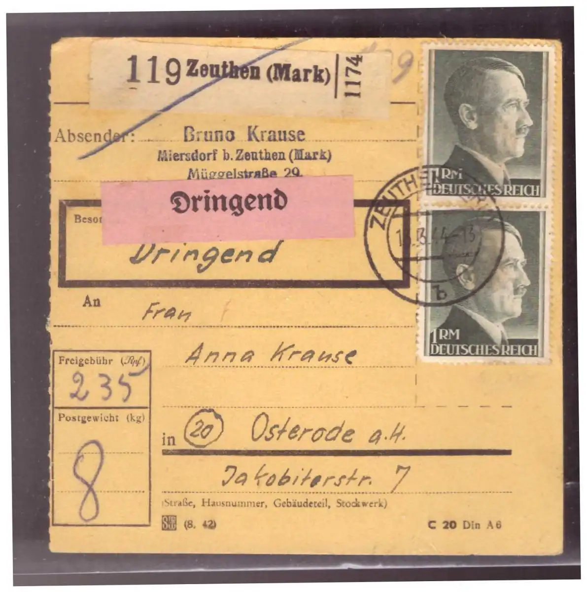Dt- Reich (020984) Paketkarte Hitlerfrankatur Zeuthen vom 16.3.1944