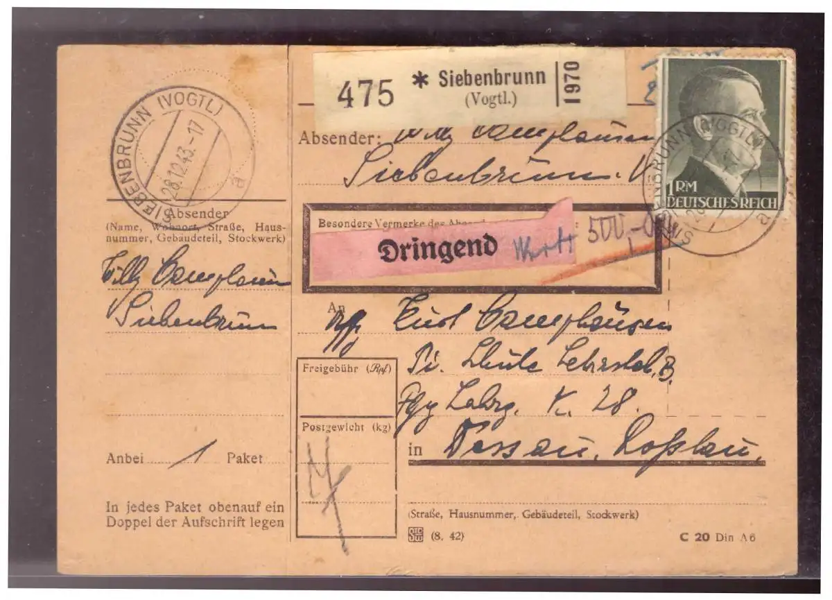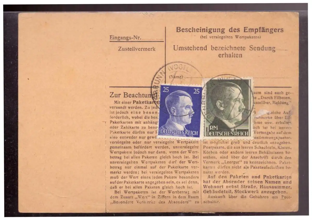 Dt- Reich (020990) Wertpaketkarte Hitlerfrankatur Siebenbürgen vom 28.12.1943