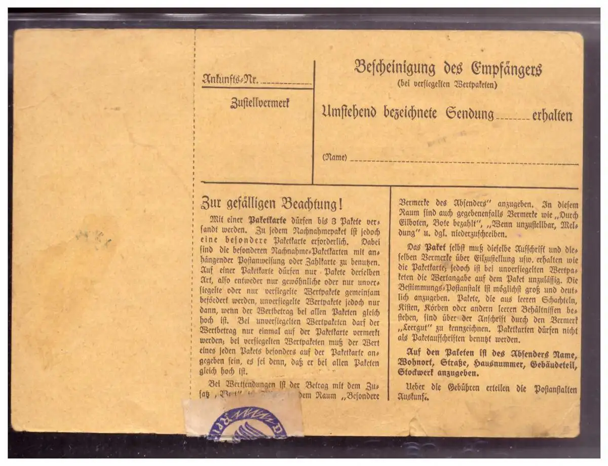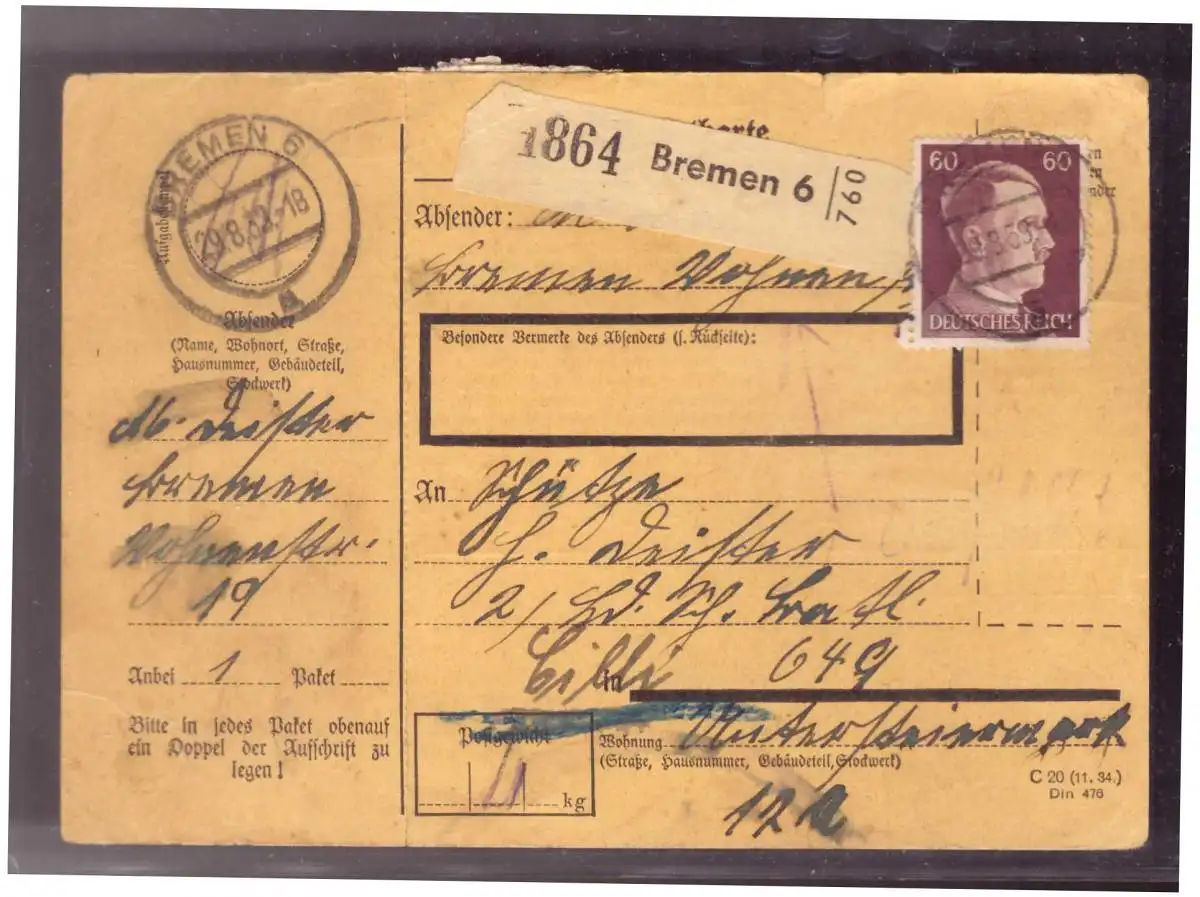 Dt- Reich (020994) Paketkarte Hitlerfrankatur Bremen vom 29.8.1933