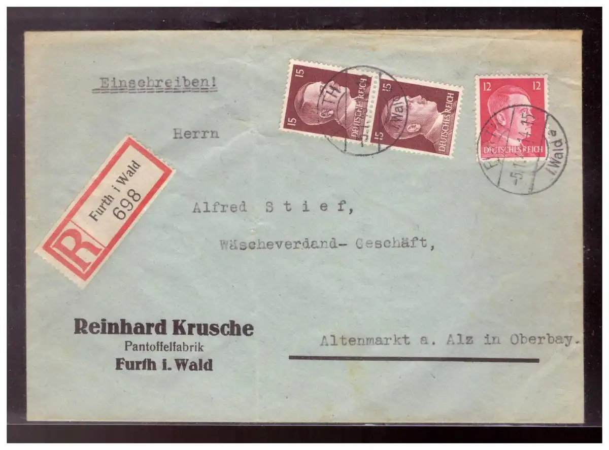 Dt- Reich (021004) Einschreiben Fernbrief Vorgedruckter Umschlag Pantoffelfabrik Kruschke, gelaufen Furth i Wald 5.1.43