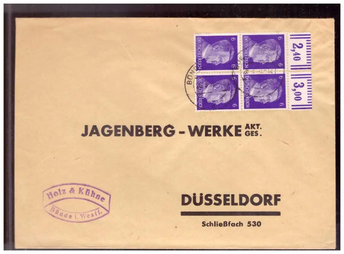 Dt- Reich (021011) Brief Vorgedrucker Firmenbrief Jagenberg- Werk, gelaufen mit Viererblock MNR 785 mit Oberrand