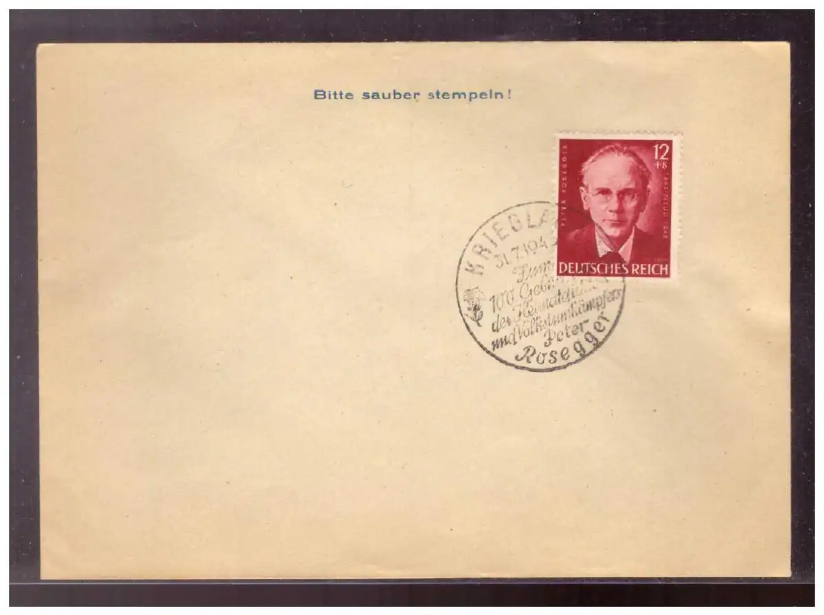 Dt- Reich (021345) Propaganda Beleg mit MNR 856 blanco mit SST Krieglach, Rosegger gest. 31.7.1943